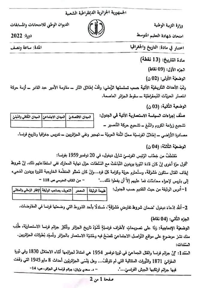 يسعدنا في مدونة التعليم و التربية ان نضع بين ايديكم و تحت تصرفكم موضوع امتحان مادة التاريخ و الجغرافيا مرفق بالتصحيح النموذجي الخاص بشهادة التعليم المتوسط 2022. و التصحيح من اعداد الاستاذ القدير فيصل كحول جزاه الله كل خير.