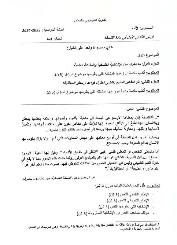يسعدنا في مدونة التعليم و التربية ان نقدم لكم الفرض الاول للثلاثي الاول في مادة الفلسفة للسنة الثانية ثانوي شعبة آداب و فلسفة نموذج رقم 1 للموسم الدراسي 2023 - 2024 جعلها الله في ميزان حسنات صاحبها الاستاذ بصديق محمد.