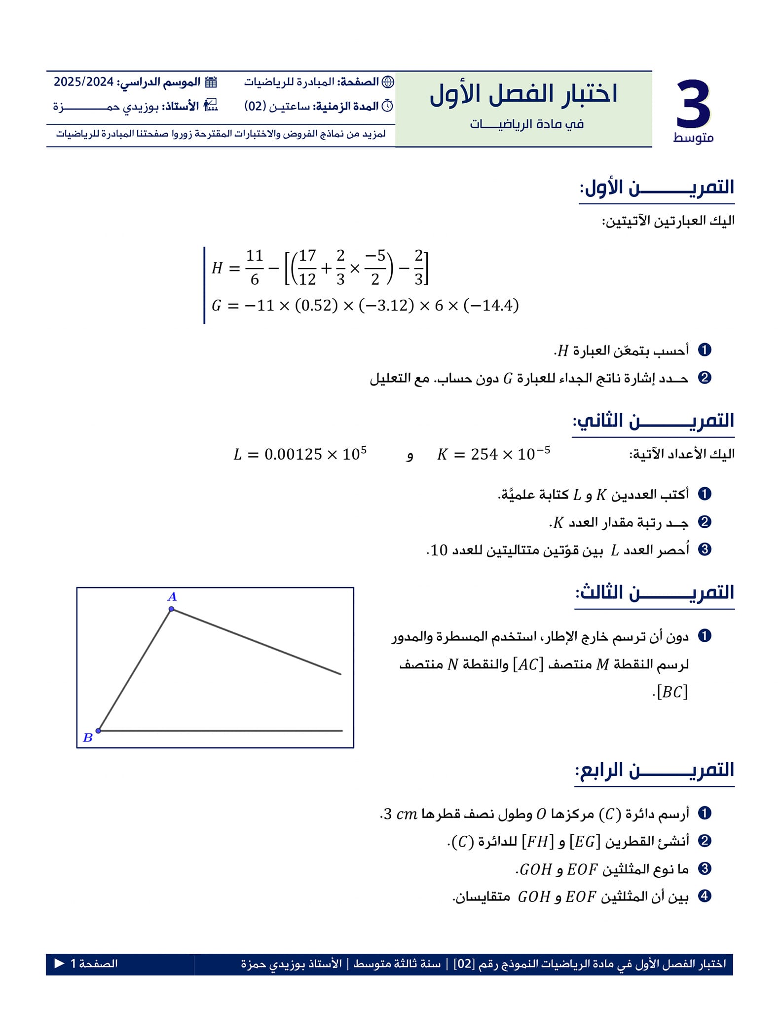 يسرنا أن نضع بين أيديكم و تحت تصرفكم اختبار الفصل الاول في مادة الرياضيات للسنة الثالثة متوسط الجيل الثاني نموذج رقم 02 للموسم الدراسي 2024 - 2025. جعلها الله في ميزان حسنات صاحبها الاستاذ بوزيدي حمزة.